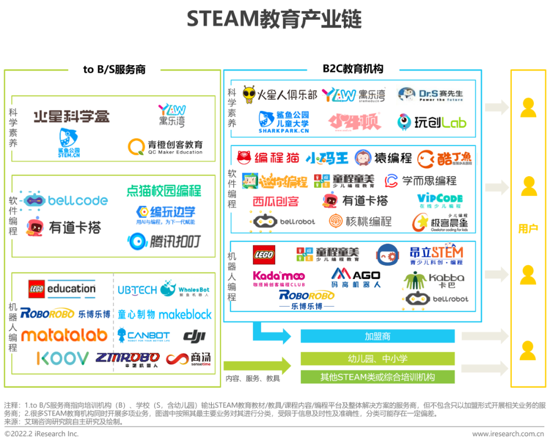 在产品和服务层面,不断有创业公司冒头,一条产业链也逐渐清晰,有ToB/S的服务商,提供科学素养、软件编程、机器人编程的内容、服务和教具,有B2C的的教育机构。