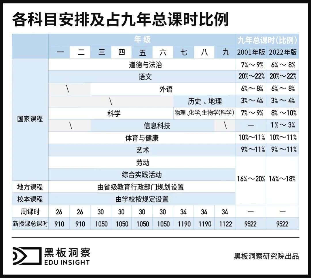 不论是历经时代变迁还是“双减”等政策要求,义务教育阶段九年 9522 节总课时都未曾改变。以上种种优化设置都是在总课时不变的基础上完成,仅在各科目占九年总课时比例上作出调整。