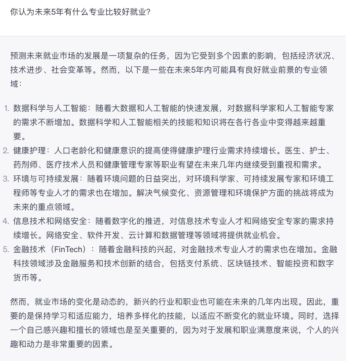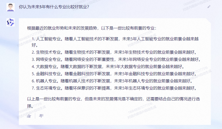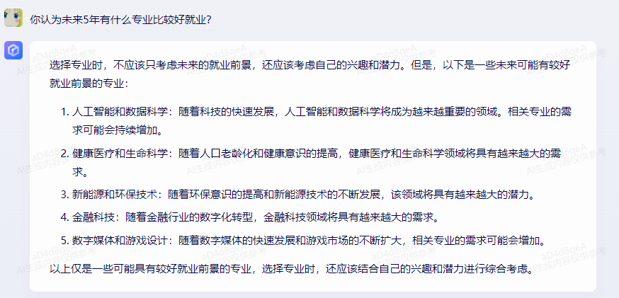 想到这个问题,我又向AI提出了新的问题:你认为未来5年有什么专业比较好就业?