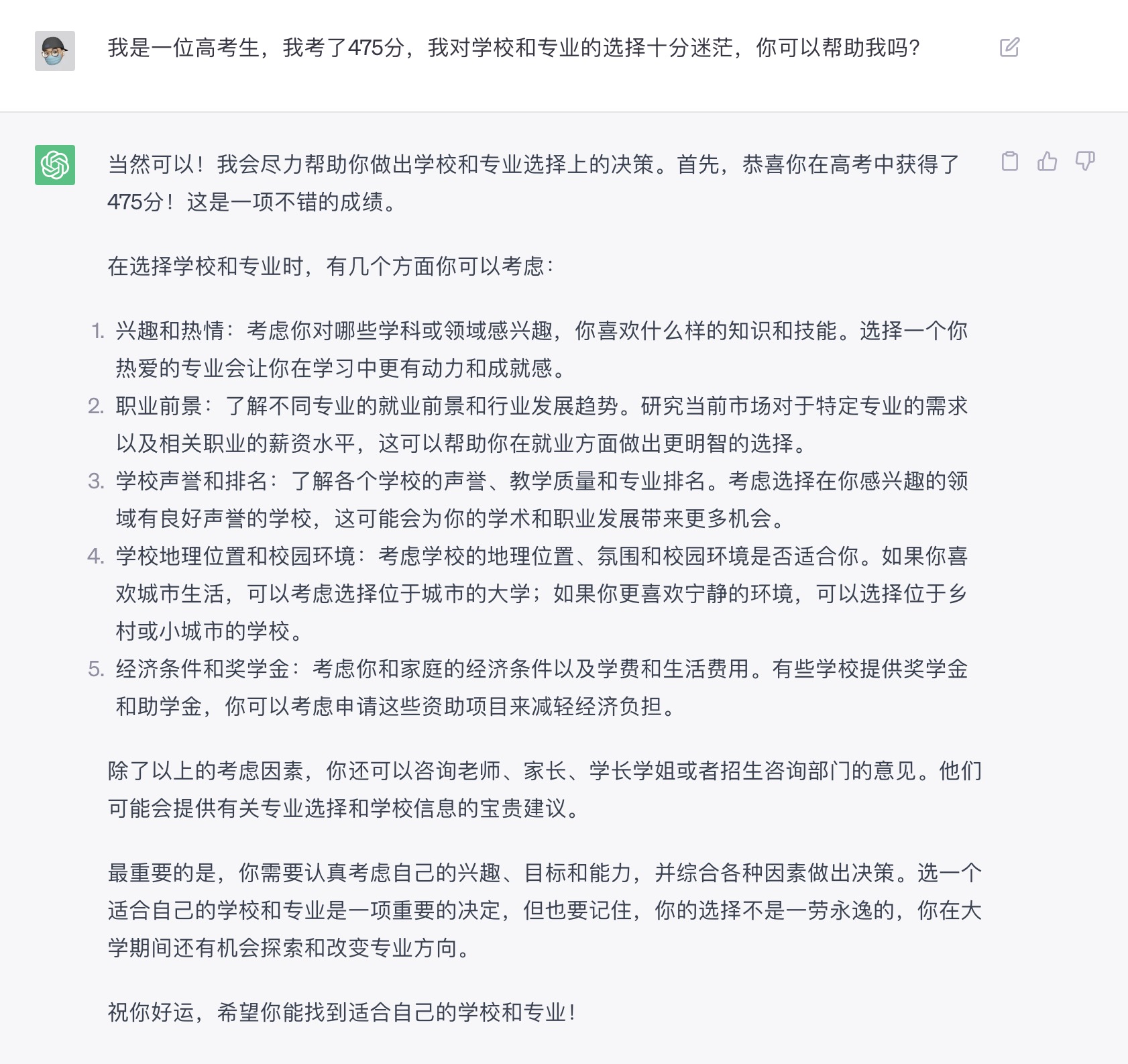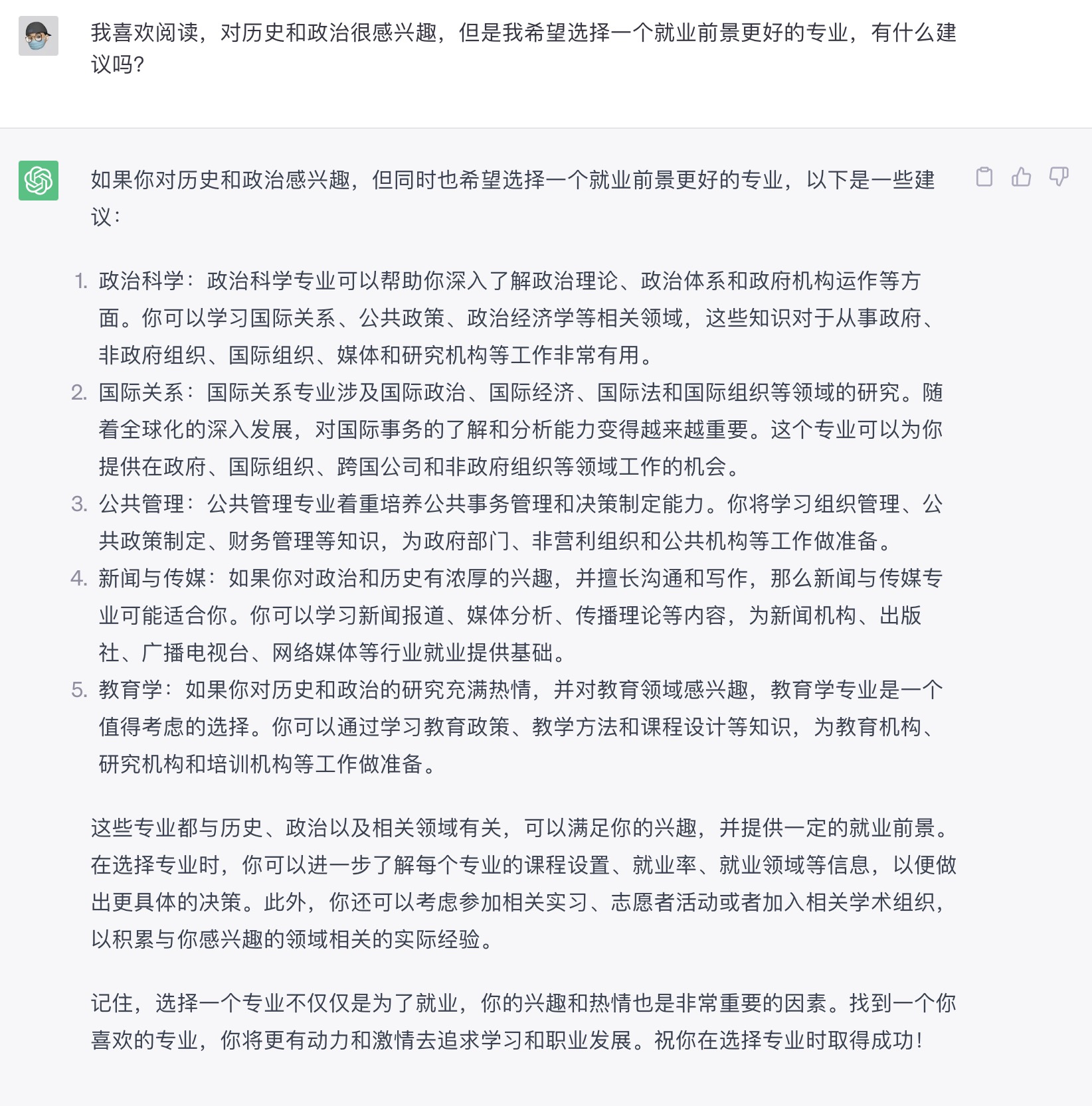 最后压轴的是被誉为最强AI的ChatGPT,相对于前三个AI,ChatGPT的回答显然要更详细,不过从内容来看区别并不大,都是从兴趣、职业前景、学校等方面进行解答,不过在结尾还提到了转专业等选择,倒是比前三个AI要更人性化一些。
