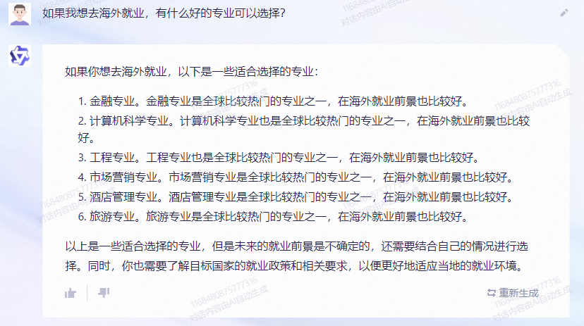 文心一言很快给出了解答:人工智能和数据科学、健康医疗和生命科学、新能源和环保技术、金融科技、数字媒体和游戏设计。基本上都是当下较为热门的专业,有意思的是文心一言还劝了一句:“选择专业不应该只考虑未来的就业前景”。