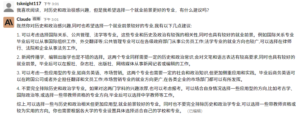 再来看看通义千问,与第一个问题的情况相似,通义千问也给出了更具体的分析,除了政治、经济学、法律、社会学等专业外,第一条建议推荐的计算机科学专业确实是我没有想到的,毕竟从专业角度来说,与历史、政治等兴趣确实不太沾边,唯一对得上的或许就是“就业前景好”一个标准了。
