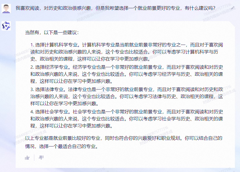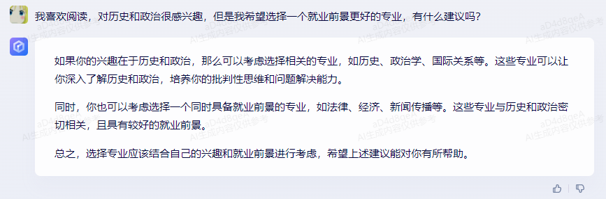 接下来让我们看看第二个问题,在问题的描述中,小雷是一位喜欢阅读、对历史和政治感兴趣的学生,希望可以在保证兴趣的情况下选择一个就业前景更好的专业,AI又会怎么回答?