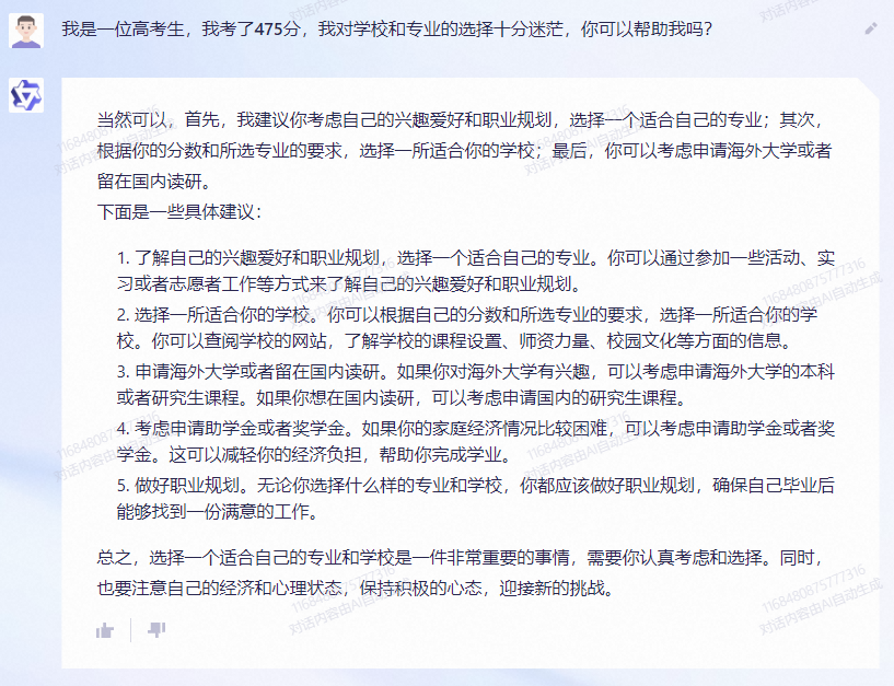 小雷首先向AI表达了自己的身份,一位高考分数475分的高考生,对志愿选择感到迷茫,希望获得帮助,来看看AI会怎么回答这个问题。