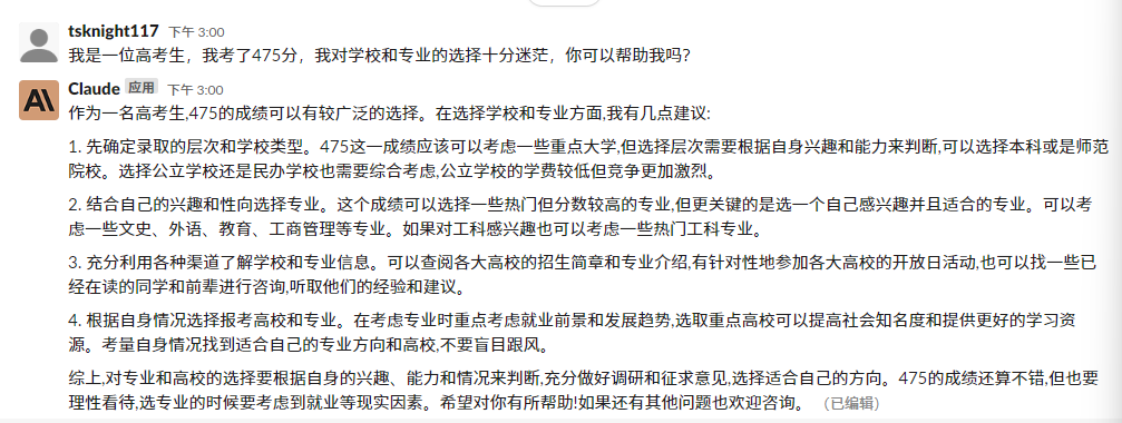 下一位出场的是Claude,这位也算是我们AI栏目的常客了,它给出的答案相对来说更具体一些,分析也更详尽,还给出了诸如民办、公办的优缺点,专业选择等建议,总体来说也是有一定参考价值的,同时也给出了一些咨询的方向。