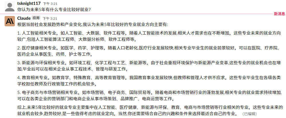 不过,Claude的回答也不是完全遵循“我”的兴趣爱好,也有单纯从就业前景出发提供的建议,比如新能源与环保相关专业、电子商务与市场营销专业等,至于这些专业是否就业前景好,小雷暂时不予置评。